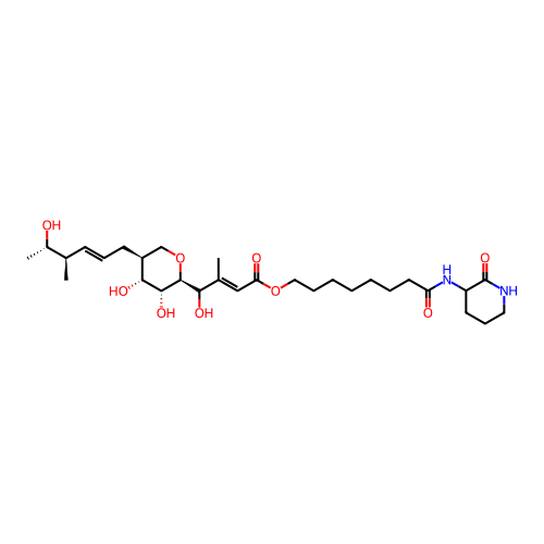 | InChI | InChI=1S/C30H50N2O9/c1-19(21(3)33)11-9-12-22-18-41-29(28(38)27(22)37)26(36)20(2)17-25(35)40-16-8-6-4-5-7-14-24(34)32-23-13-10-15-31-30(23)39/h9,11,17,19,21-23,26-29,33,36-38H,4-8,10,12-16,18H2,1-3H3,(H,31,39)(H,32,34)/b11-9+,20-17+/t19-,21+,22+,23?,26?,27-,28-,29+/m1/s1 |