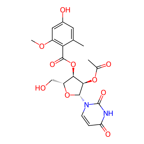 | InChI | InChI=1S/C20H22N2O10/c1-9-6-11(25)7-12(29-3)15(9)19(27)32-16-13(8-23)31-18(17(16)30-10(2)24)22-5-4-14(26)21-20(22)28/h4-7,13,16-18,23,25H,8H2,1-3H3,(H,21,26,28)/t13-,16-,17-,18-/m1/s1 |