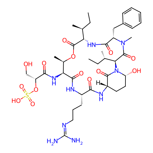 | SMILES | CC[C@H](C)[C@H]1C(=O)O[C@@H]([C@@H](C(=O)N[C@H](C(=O)N[C@H]2CC[C@H](N(C2=O)[C@H](C(=O)N([C@H](C(=O)N1)CC3=CC=CC=C3)C)[C@@H](C)CC)O)CCCN=C(N)N)NC(=O)[C@@H](CO)OS(=O)(=O)O)C |