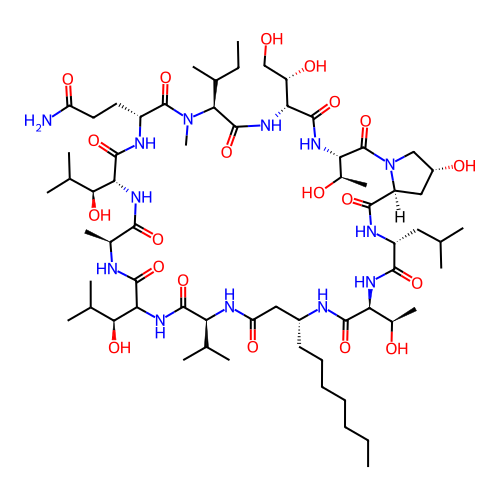 | SMILES | CCCCCCC[C@@H]1CC(=O)N[C@H](C(=O)NC(C(=O)N[C@H](C(=O)N[C@@H](C(=O)N[C@@H](C(=O)N([C@H](C(=O)N[C@@H](C(=O)N[C@H](C(=O)N2C[C@@H](C[C@H]2C(=O)N[C@@H](C(=O)N[C@H](C(=O)N1)[C@@H](C)O)CC(C)C)O)[C@@H](C)O)[C@H](CO)O)C(C)CC)C)CCC(=O)N)[C@H](C(C)C)O)C)[C@H](C(C)C)O)C(C)C |
