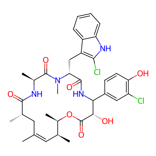 | SMILES | C[C@H]1C/C(=C\[C@@H]([C@H](OC(=O)[C@H](C(NC(=O)[C@H](N(C(=O)[C@@H](NC1=O)C)C)CC2=C(NC3=CC=CC=C32)Cl)C4=CC(=C(C=C4)O)Cl)O)C)C)/C |