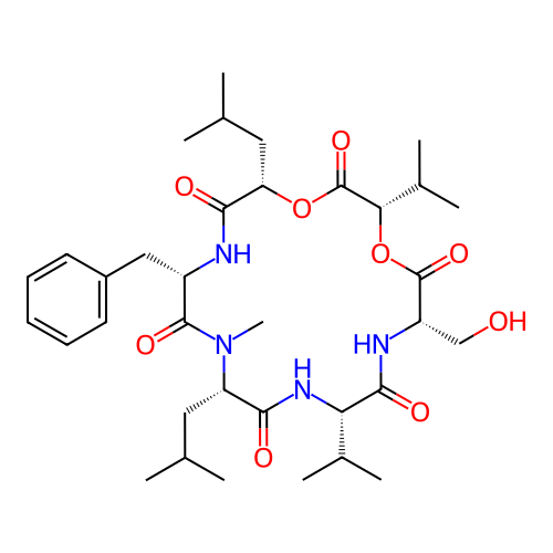 | SMILES | CC(C)C[C@H]1C(=O)N[C@H](C(=O)N[C@H](C(=O)O[C@H](C(=O)O[C@H](C(=O)N[C@H](C(=O)N1C)CC2=CC=CC=C2)CC(C)C)C(C)C)CO)C(C)C |