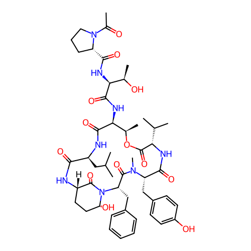 | SMILES | C[C@@H]1[C@@H](C(=O)N[C@H](C(=O)N[C@H]2CC[C@H](N(C2=O)[C@H](C(=O)N([C@H](C(=O)N[C@H](C(=O)O1)C(C)C)CC3=CC=C(C=C3)O)C)CC4=CC=CC=C4)O)CC(C)C)NC(=O)[C@H]([C@@H](C)O)NC(=O)[C@@H]5CCCN5C(=O)C |