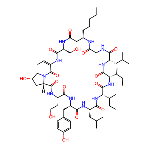 | SMILES | CCCCC[C@@H]1CC(=O)N[C@H](C(=O)N/C(=C/C)/C(=O)N2C[C@@H](C[C@H]2C(=O)N[C@H](C(=O)N[C@@H](C(=O)N[C@@H](C(=O)N[C@H](C(=O)N[C@H](C(=O)N[C@H](C(=O)NCC(=O)N1)CC(C)C)C(C)CC)C(C)CC)CC(C)C)CC3=CC=C(C=C3)O)CCO)O)CO |