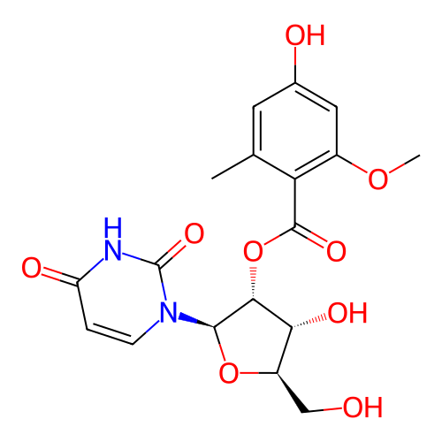 | InChI | InChI=1S/C18H20N2O9/c1-8-5-9(22)6-10(27-2)13(8)17(25)29-15-14(24)11(7-21)28-16(15)20-4-3-12(23)19-18(20)26/h3-6,11,14-16,21-22,24H,7H2,1-2H3,(H,19,23,26)/t11-,14-,15-,16-/m1/s1 |