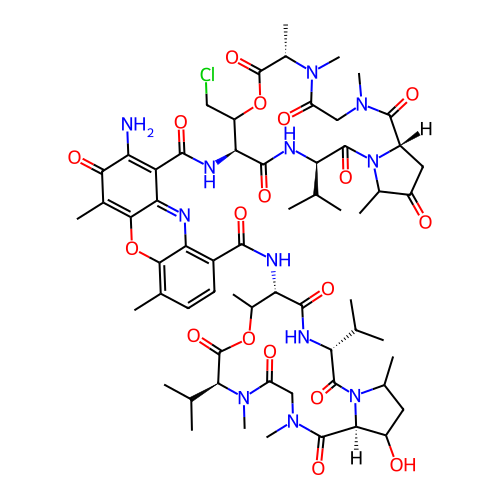| SMILES | C[C@H]1C(=O)OC([C@@H](C(=O)N[C@@H](C(=O)N2[C@@H](CC(=O)C2C)C(=O)N(CC(=O)N1C)C)C(C)C)NC(=O)C3=C(C(=O)C(=C4C3=NC5=C(C=CC(=C5O4)C)C(=O)N[C@H]6C(OC(=O)[C@@H](N(C(=O)CN(C(=O)[C@@H]7C(CC(N7C(=O)[C@H](NC6=O)C(C)C)C)O)C)C)C(C)C)C)C)N)CCl |