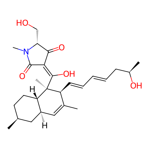 | InChI | InChI=1S/C27H39NO5/c1-16-11-12-21-19(13-16)14-17(2)20(10-8-6-7-9-18(3)30)27(21,4)25(32)23-24(31)22(15-29)28(5)26(23)33/h6-8,10,14,16,18-22,29-30,32H,9,11-13,15H2,1-5H3/b7-6+,10-8+,25-23?/t16-,18+,19+,20-,21-,22+,27-/m0/s1 |