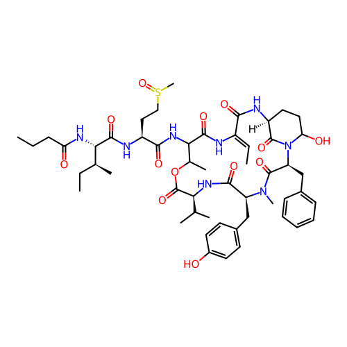 | SMILES | CCCC(=O)N[C@@H]([C@@H](C)CC)C(=O)N[C@@H](CCS(=O)C)C(=O)NC1C(OC(=O)[C@@H](NC(=O)[C@@H](N(C(=O)[C@@H](N2C(CC[C@@H](C2=O)NC(=O)/C(=C/C)/NC1=O)O)CC3=CC=CC=C3)C)CC4=CC=C(C=C4)O)C(C)C)C |
