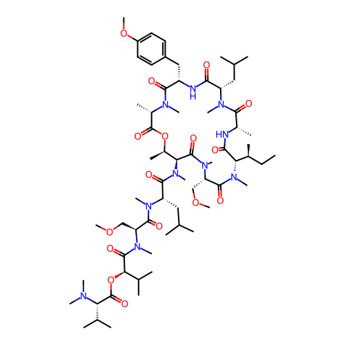 | SMILES | CC[C@H](C)[C@H]1C(=O)N[C@@H](C)C(=O)N(C)[C@@H](CC(C)C)C(=O)N[C@@H](CC2=CC=C(OC)C=C2)C(=O)N(C)[C@@H](C)C(=O)O[C@H](C)[C@H](N(C)C(=O)[C@H](CC(C)C)N(C)C(=O)[C@H](COC)N(C)C(=O)[C@H](OC(=O)[C@H](C(C)C)N(C)C)C(C)C)C(=O)N(C)[C@@H](COC)C(=O)N1C |