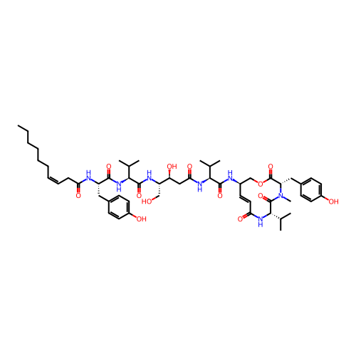 | SMILES | CCCCCC/C=C\CC(=O)N[C@@H](CC1=CC=C(C=C1)O)C(=O)N[C@@H](C(C)C)C(=O)N[C@@H](CO)[C@H](CC(=O)N[C@@H](C(C)C)C(=O)N[C@H]2COC(=O)[C@@H](N(C(=O)[C@@H](NC(=O)C=C2)C(C)C)C)CC3=CC=C(C=C3)O)O |