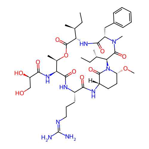 | SMILES | CC[C@H](C)[C@H]1C(=O)O[C@@H]([C@@H](C(=O)N[C@H](C(=O)N[C@H]2CC[C@H](N(C2=O)[C@H](C(=O)N([C@H](C(=O)N1)CC3=CC=CC=C3)C)[C@@H](C)CC)OC)CCCN=C(N)N)NC(=O)[C@@H](CO)O)C |