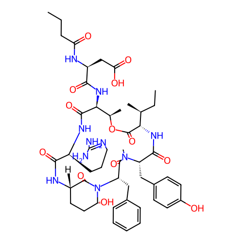 | SMILES | CCCC(=O)N[C@@H](CC(=O)O)C(=O)N[C@H]1[C@H](OC(=O)[C@@H](NC(=O)[C@@H](N(C(=O)[C@@H](N2[C@@H](CC[C@@H](C2=O)NC(=O)[C@@H](NC1=O)CCCN=C(N)N)O)CC3=CC=CC=C3)C)CC4=CC=C(C=C4)O)[C@@H](C)CC)C |