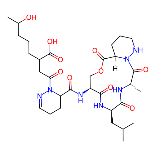 | SMILES | C[C@H]1C(=O)N2[C@H](CCCN2)C(=O)OC[C@@H](C(=O)N[C@@H](C(=O)N1)CC(C)C)NC(=O)C3CCC=NN3C(=O)CC(CCCC(C)O)C(=O)O |