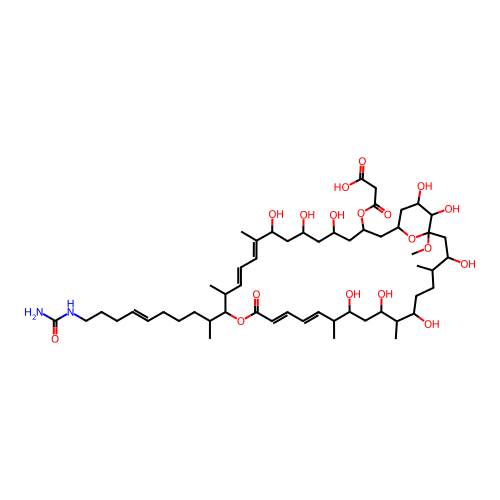 | SMILES | CC1CCC(C(C(CC(C(/C=C/C=C/C(=O)OC(C(/C=C/C=C(/C(CC(CC(CC(CC2CC(C(C(O2)(CC1O)OC)O)O)OC(=O)CC(=O)O)O)O)O)\C)C)C(C)CCC/C=C/CCCNC(=O)N)C)O)O)C)O |