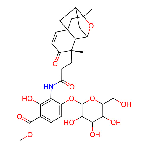 | InChI | InChI=1S/C31H39NO12/c1-29(19(34)6-9-31-11-14-10-17(26(29)31)44-30(14,2)13-31)8-7-20(35)32-21-16(5-4-15(22(21)36)27(40)41-3)42-28-25(39)24(38)23(37)18(12-33)43-28/h4-6,9,14,17-18,23-26,28,33,36-39H,7-8,10-13H2,1-3H3,(H,32,35)/t14?,17?,18?,23?,24?,25?,26?,28?,29-,30?,31?/m1/s1 |