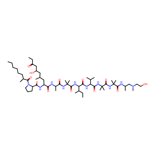 | SMILES | CCCCCCC(C)C(=O)N1CCCC1C(=O)NC(CC(C)CC(CC(=O)CC)O)C(=O)NC(C)C(=O)NC(C)(C)C(=O)NC(C(C)CC)C(=O)NC(C(C)C)C(=O)NC(C)(C)C(=O)NC(C)(C)C(=O)NC(C)CN(C)CCO |