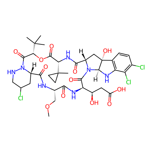 | SMILES | CC1(CC1)[C@@H]2C(=O)O[C@H](C(=O)N3[C@@H](CC(CN3)Cl)C(=O)N[C@H](C(=O)N[C@@H](C(=O)N4[C@@H](C[C@@]5([C@H]4NC6=C5C=CC(=C6Cl)Cl)O)C(=O)N2)[C@@H](CC(=O)O)O)COC)C(C)(C)C |