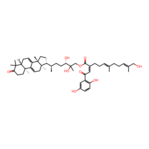 | SMILES | CC(=CCCC(C)=CCC/C(=C/C(=O)C1=C(O)C=CC(O)=C1)C(=O)OCC(C)(O)[C@@H](O)CC[C@@H](C)[C@H]1CC[C@@]2(C)C3=CC[C@H]4C(C)(C)C(=O)CC[C@]4(C)C3=CC[C@]12C)CO |