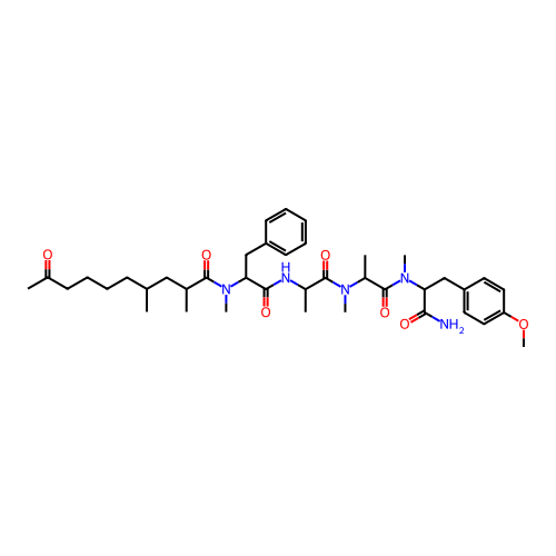 | SMILES | CC(CCCCC(=O)C)CC(C)C(=O)N(C)C(CC1=CC=CC=C1)C(=O)NC(C)C(=O)N(C)C(C)C(=O)N(C)C(CC2=CC=C(C=C2)OC)C(=O)N |