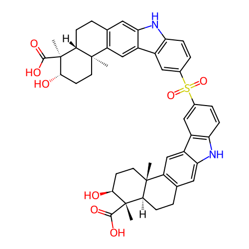 | InChI | InChI=1S/C46H48N2O8S/c1-43-15-13-39(49)45(3,41(51)52)37(43)11-5-23-17-35-29(21-31(23)43)27-19-25(7-9-33(27)47-35)57(55,56)26-8-10-34-28(20-26)30-22-32-24(18-36(30)48-34)6-12-38-44(32,2)16-14-40(50)46(38,4)42(53)54/h7-10,17-22,37-40,47-50H,5-6,11-16H2,1-4H3,(H,51,52)(H,53,54)/t37-,38-,39+,40+,43-,44-,45+,46+/m1/s1 |