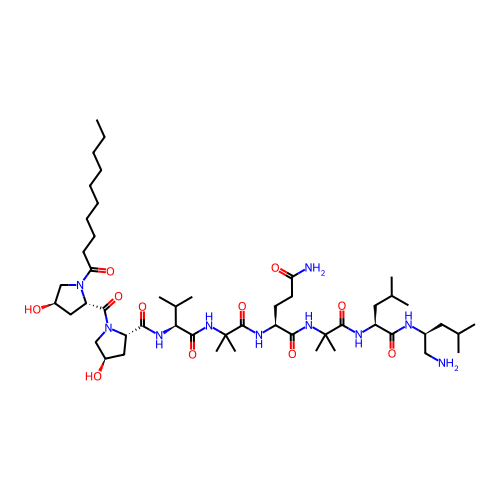 | SMILES | CCCCCCCCCC(=O)N1C[C@@H](C[C@H]1C(=O)N2C[C@@H](C[C@H]2C(=O)N[C@@H](C(C)C)C(=O)NC(C)(C)C(=O)N[C@@H](CCC(=O)N)C(=O)NC(C)(C)C(=O)N[C@@H](CC(C)C)C(=O)N[C@@H](CC(C)C)CN)O)O |