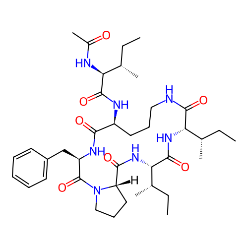| SMILES | CC[C@H](C)[C@H]1C(=O)N[C@H](C(=O)NCCC[C@@H](C(=O)N[C@@H](C(=O)N2CCC[C@H]2C(=O)N1)CC3=CC=CC=C3)NC(=O)[C@H]([C@@H](C)CC)NC(=O)C)[C@@H](C)CC |