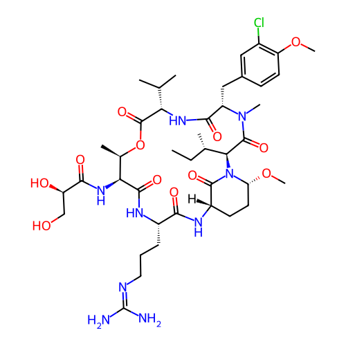 | SMILES | CC[C@H](C)[C@H]1C(=O)N([C@H](C(=O)N[C@H](C(=O)O[C@@H]([C@@H](C(=O)N[C@H](C(=O)N[C@H]2CC[C@H](N1C2=O)OC)CCCN=C(N)N)NC(=O)[C@@H](CO)O)C)C(C)C)CC3=CC(=C(C=C3)OC)Cl)C |