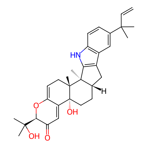 | SMILES | C[C@]12CC=C3C(=CC(=O)[C@H](O3)C(C)(C)O)[C@@]1(CC[C@@H]4[C@@]2(C5=C(C4)C6=C(N5)C=CC(=C6)C(C)(C)C=C)C)O |