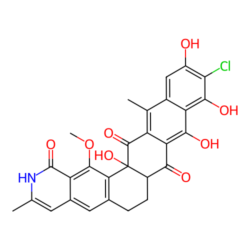 | InChI | InChI=1S/C28H22ClNO8/c1-9-6-12-7-11-4-5-14-22(32)19-16(10(2)13-8-15(31)21(29)24(34)18(13)23(19)33)26(35)28(14,37)20(11)25(38-3)17(12)27(36)30-9/h6-8,14,31,33-34,37H,4-5H2,1-3H3,(H,30,36) |