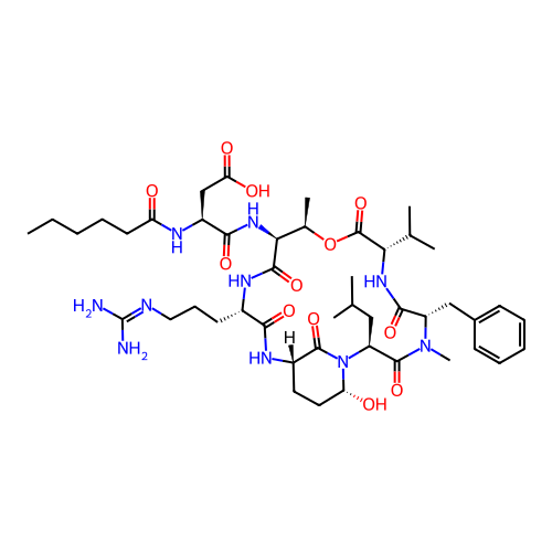 | SMILES | CCCCCC(=O)N[C@@H](CC(=O)O)C(=O)N[C@H]1[C@H](OC(=O)[C@@H](NC(=O)[C@@H](N(C(=O)[C@@H](N2[C@@H](CC[C@@H](C2=O)NC(=O)[C@@H](NC1=O)CCCN=C(N)N)O)CC(C)C)C)CC3=CC=CC=C3)C(C)C)C |