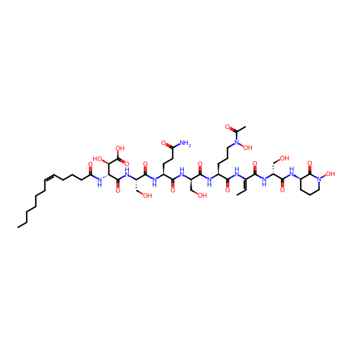 | SMILES | CCCCCC/C=C\CCCC(=O)N[C@H]([C@H](C(=O)O)O)C(=O)N[C@@H](CO)C(=O)N[C@@H](CCC(=O)N)C(=O)N[C@H](CO)C(=O)N[C@@H](CCCN(C(=O)C)O)C(=O)N/C(=C\C)/C(=O)N[C@H](CO)C(=O)N[C@@H]1CCCN(C1=O)O |