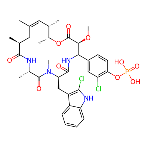 | SMILES | C[C@H]1C/C(=C\[C@@H]([C@H](OC(=O)[C@H](C(NC(=O)[C@H](N(C(=O)[C@@H](NC1=O)C)C)CC2=C(NC3=CC=CC=C32)Cl)C4=CC(=C(C=C4)OP(=O)(O)O)Cl)OC)C)C)/C |