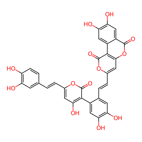 | InChI | InChI=1S/C33H20O13/c34-21-6-2-14(7-22(21)35)1-4-16-9-27(40)29(32(42)44-16)18-11-24(37)23(36)8-15(18)3-5-17-10-28-30(33(43)45-17)19-12-25(38)26(39)13-20(19)31(41)46-28/h1-13,34-40H/b4-1+,5-3+ |