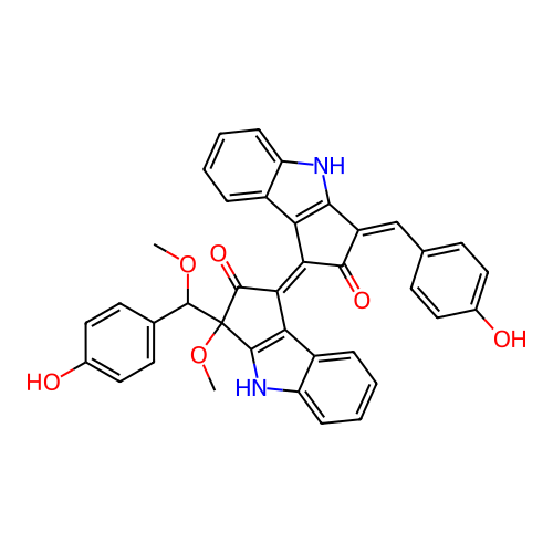 | InChI | InChI=1S/C38H28N2O6/c1-45-37(21-13-17-23(42)18-14-21)38(46-2)35-30(25-8-4-6-10-28(25)40-35)32(36(38)44)31-29-24-7-3-5-9-27(24)39-33(29)26(34(31)43)19-20-11-15-22(41)16-12-20/h3-19,37,39-42H,1-2H3/b26-19-,32-31+ |
