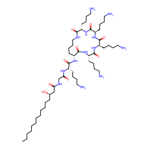 | SMILES | CCCCCCCCCCCC[C@H](CC(=O)NCC(=O)N[C@@H](CCCCN)C(=O)N[C@@H]1CCCCNC(=O)[C@@H](NC(=O)[C@H](NC(=O)[C@H](NC(=O)[C@@H](NC1=O)CCCCN)CCCCN)CCCCN)CCCCN)O |