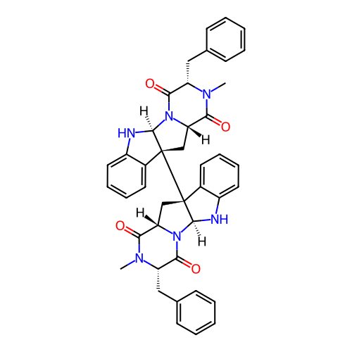| SMILES | CN1[C@H](C(=O)N2[C@H](C1=O)C[C@@]3([C@H]2NC4=CC=CC=C43)[C@@]56C[C@H]7C(=O)N([C@H](C(=O)N7[C@@H]5NC8=CC=CC=C68)CC9=CC=CC=C9)C)CC1=CC=CC=C1 |