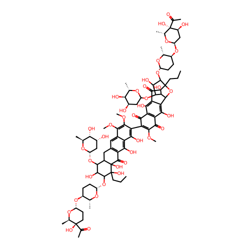 | SMILES | CCCC1(C(C(C(C2C1(C(=O)C3=C(C2)C=C4C(=C3O)C(=C(C(=C4OC)OC)C5=C(C(=O)C6=C(C5=O)C(=C7C(=C6O)C8C9C(C(C(C(C9(C7=O)O)(O8)CCC)O[C@H]1CC[C@@H]([C@H](O1)C)O[C@@H]1C[C@@H]([C@@]([C@H](O1)C)(C(=O)C)O)O)O)OC1C[C@H]([C@H]([C@@H](O1)C)O)O)O)OC)O)O)O[C@H]1C[C@H]([C@H]([C@@H](O1)C)O)O)O)O[C@H]1CC[C@@H]([C@H](O1)C)O[C@@H]1CC[C@@]([C@H](O1)C)(C(=O)C)O)O |