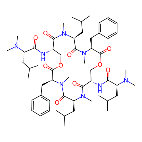 | SMILES | CC(C)C[C@H]1C(=O)N([C@H](C(=O)OC[C@@H](C(=O)N([C@H](C(=O)N([C@H](C(=O)OC[C@@H](C(=O)N1C)NC(=O)[C@H](CC(C)C)N(C)C)CC2=CC=CC=C2)C)CC(C)C)C)NC(=O)[C@H](CC(C)C)N(C)C)CC3=CC=CC=C3)C |