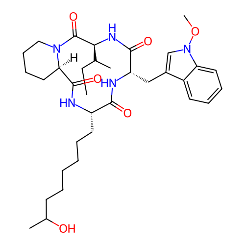 | SMILES | CCC(C)[C@H]1C(=O)N2CCCC[C@@H]2C(=O)N[C@H](C(=O)N[C@H](C(=O)N1)CC3=CN(C4=CC=CC=C43)OC)CCCCCCC(C)O |