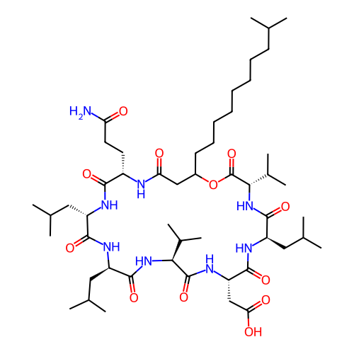 | SMILES | CC(C)CCCCCCCCC1CC(=O)N[C@H](C(=O)N[C@H](C(=O)N[C@@H](C(=O)N[C@H](C(=O)N[C@H](C(=O)N[C@@H](C(=O)N[C@H](C(=O)O1)C(C)C)CC(C)C)CC(=O)O)C(C)C)CC(C)C)CC(C)C)CCC(=O)N |