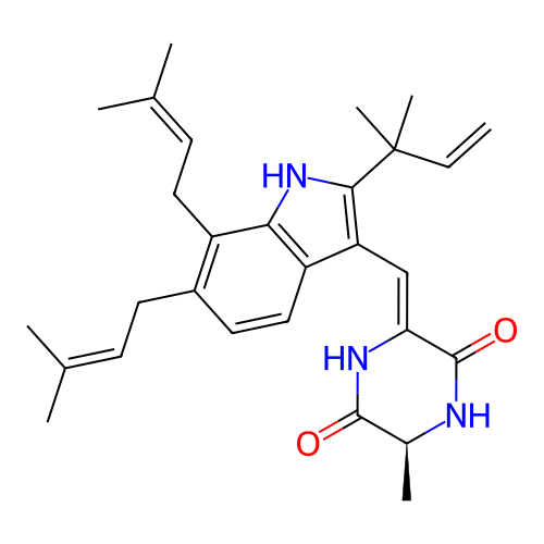 | SMILES | C[C@H]1C(=O)N/C(=C\C2=C(NC3=C2C=CC(=C3CC=C(C)C)CC=C(C)C)C(C)(C)C=C)/C(=O)N1 |