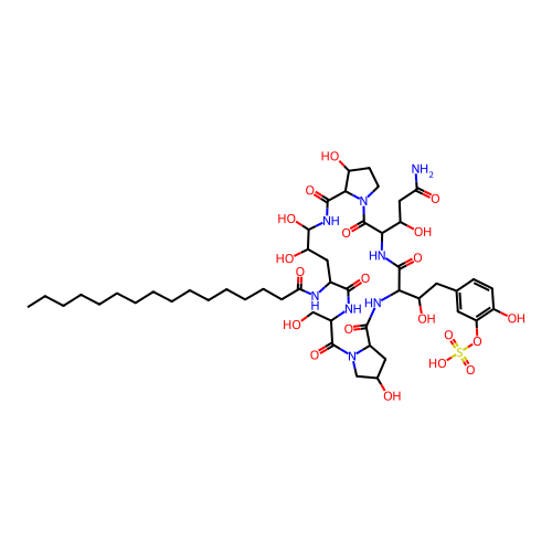 | SMILES | CCCCCCCCCCCCCCCC(=O)NC1CC(C(NC(=O)C2C(CCN2C(=O)C(NC(=O)C(NC(=O)C3CC(CN3C(=O)C(NC1=O)CO)O)C(CC4=CC(=C(C=C4)O)OS(=O)(=O)O)O)C(CC(=O)N)O)O)O)O |