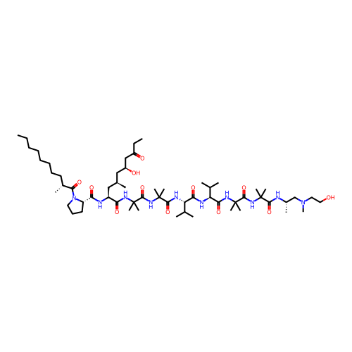| SMILES | CCCCCCCC[C@@H](C)C(=O)N1CCC[C@H]1C(=O)N[C@@H](C[C@H](C)C[C@@H](CC(=O)CC)O)C(=O)NC(C)(C)C(=O)NC(C)(C)C(=O)N[C@@H](C(C)C)C(=O)N[C@@H](C(C)C)C(=O)NC(C)(C)C(=O)NC(C)(C)C(=O)N[C@@H](C)CN(C)CCO |