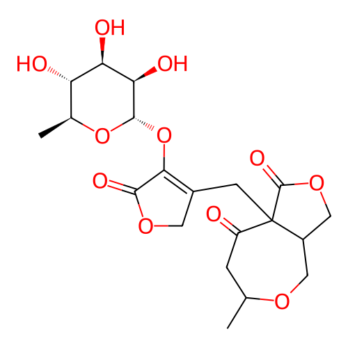 | InChI | InChI=1S/C20H26O11/c1-8-3-12(21)20(11(6-27-8)7-29-19(20)26)4-10-5-28-17(25)16(10)31-18-15(24)14(23)13(22)9(2)30-18/h8-9,11,13-15,18,22-24H,3-7H2,1-2H3/t8?,9-,11?,13-,14+,15+,18-,20?/m0/s1 |