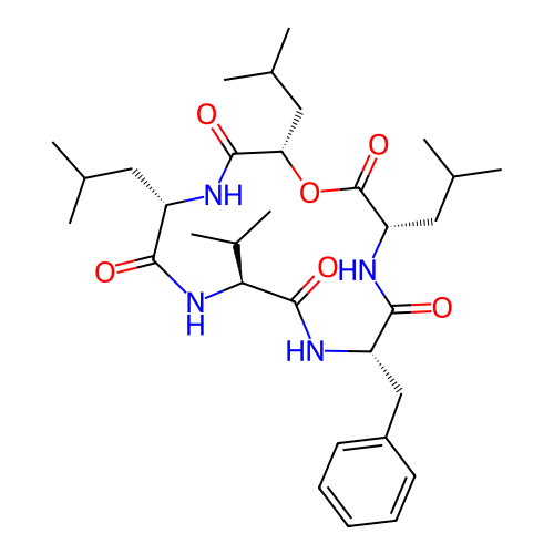 | SMILES | CC(C)C[C@H]1C(=O)N[C@H](C(=O)N[C@H](C(=O)N[C@H](C(=O)O[C@H](C(=O)N1)CC(C)C)CC(C)C)CC2=CC=CC=C2)C(C)C |