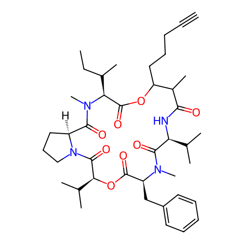 | SMILES | CCC(C)[C@H]1C(=O)OC(C(C(=O)N[C@H](C(=O)N([C@H](C(=O)O[C@H](C(=O)N2CCC[C@H]2C(=O)N1C)C(C)C)CC3=CC=CC=C3)C)C(C)C)C)CCCC#C |
