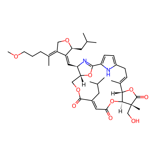 | InChI | InChI=1S/C41H56N2O10/c1-23(2)16-27-18-35(45)52-37-36(53-40(47)41(37,7)22-44)26(6)11-12-28-13-14-31(42-28)38-43-32(34(51-38)21-50-39(27)46)19-29-30(25(5)10-9-15-48-8)20-49-33(29)17-24(3)4/h11,13-14,18-19,23-24,32-34,36-37,42,44H,9-10,12,15-17,20-22H2,1-8H3/b26-11+,27-18+,29-19-,30-25+/t32-,33+,34-,36+,37+,41-/m1/s1 |