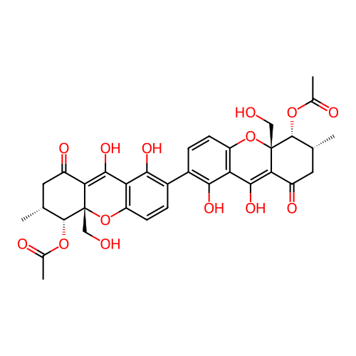 | InChI | InChI=1S/C34H34O14/c1-13-9-19(39)25-29(43)23-21(47-33(25,11-35)31(13)45-15(3)37)7-5-17(27(23)41)18-6-8-22-24(28(18)42)30(44)26-20(40)10-14(2)32(46-16(4)38)34(26,12-36)48-22/h5-8,13-14,31-32,35-36,41-44H,9-12H2,1-4H3/t13-,14-,31-,32-,33+,34+/m1/s1 |