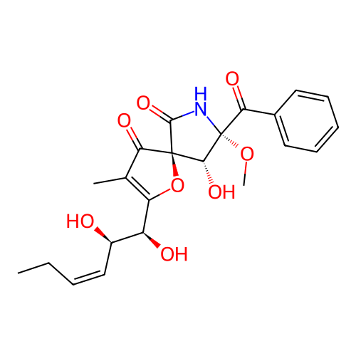 | CCMSLIB00004711506 | Bronze | (5S,8S)-8-benzoyl-2-[(Z,1S,2S)-1,2-dihydroxyhex-3-enyl]-9-hydroxy-8-methoxy-3-methyl-1-oxa-7-azaspiro[4.4]non-2-ene-4,6-dione |