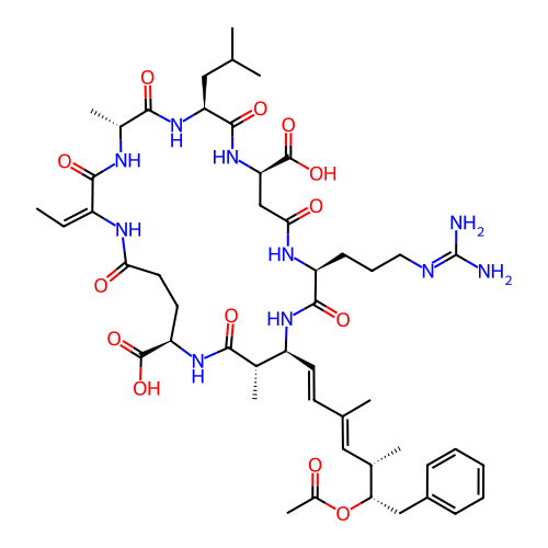 | SMILES | CC=C1C(=O)N[C@@H](C(=O)N[C@H](C(=O)N[C@H](CC(=O)N[C@H](C(=O)N[C@H]([C@@H](C(=O)N[C@H](CCC(=O)N1)C(=O)O)C)/C=C/C(=C/[C@H](C)[C@H](CC2=CC=CC=C2)OC(=O)C)/C)CCCN=C(N)N)C(=O)O)CC(C)C)C |